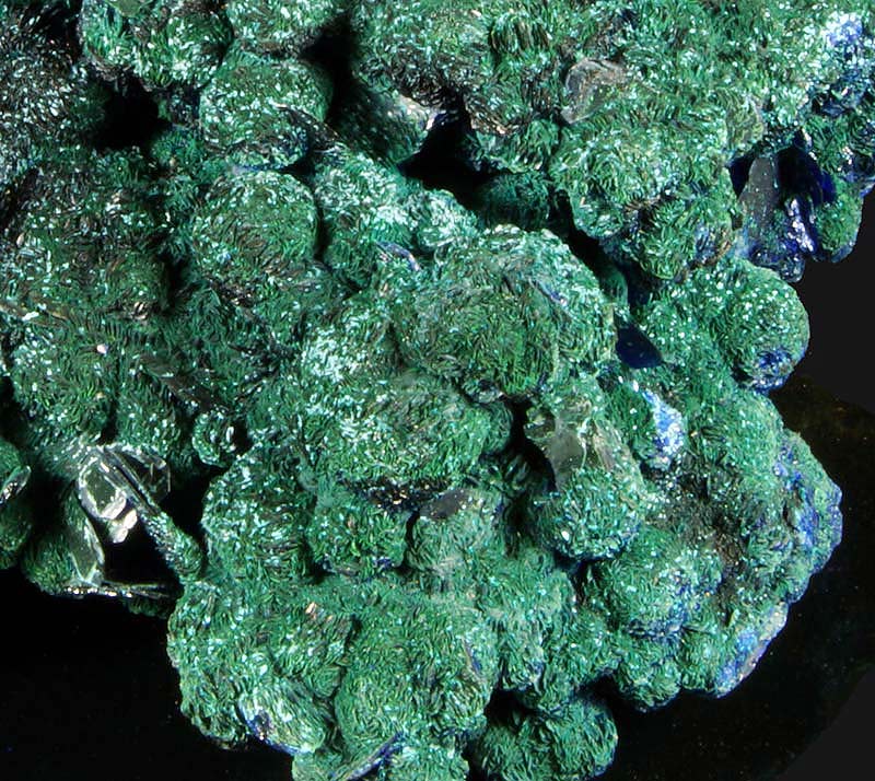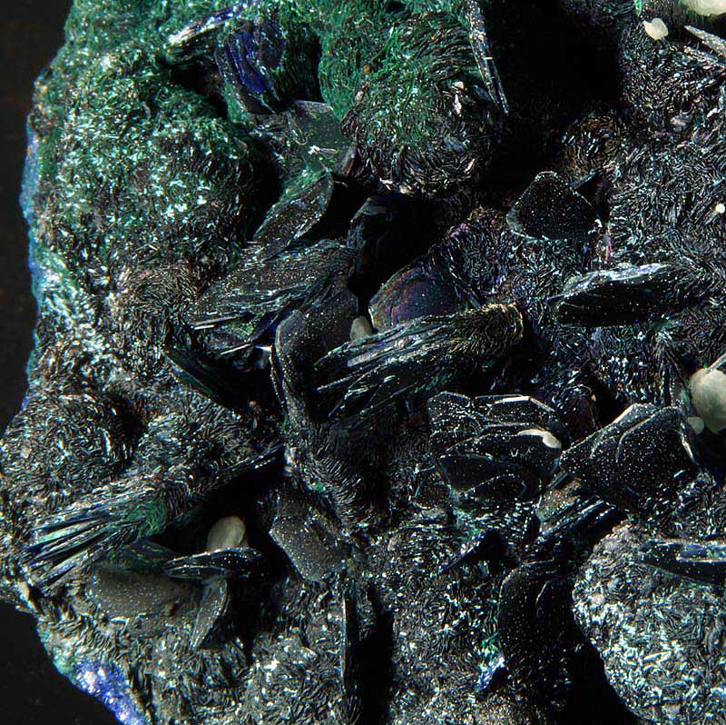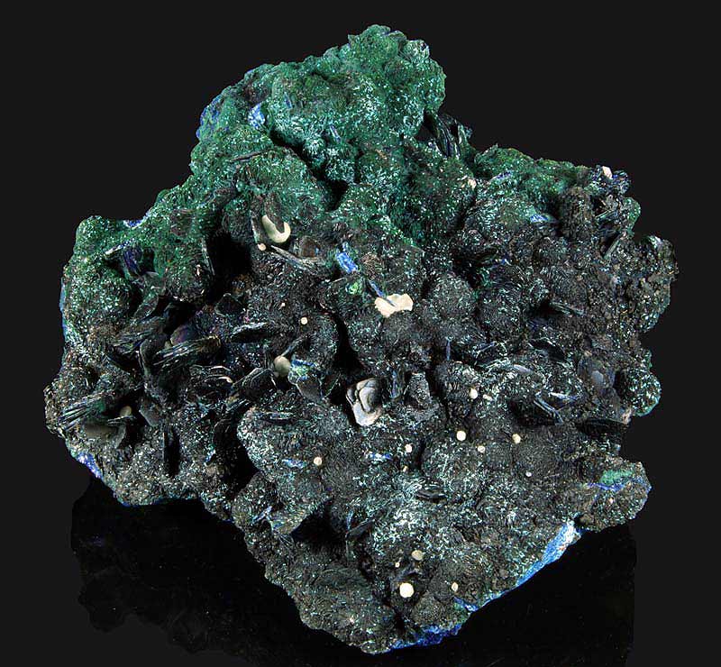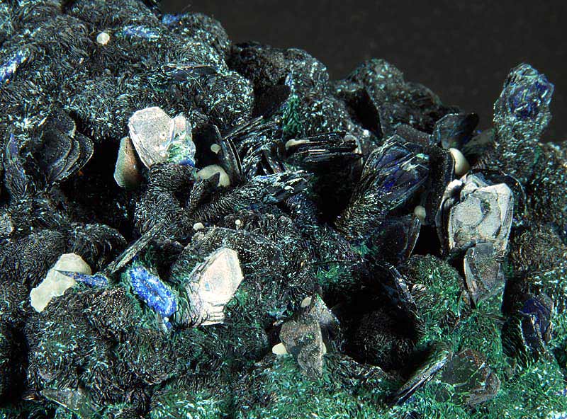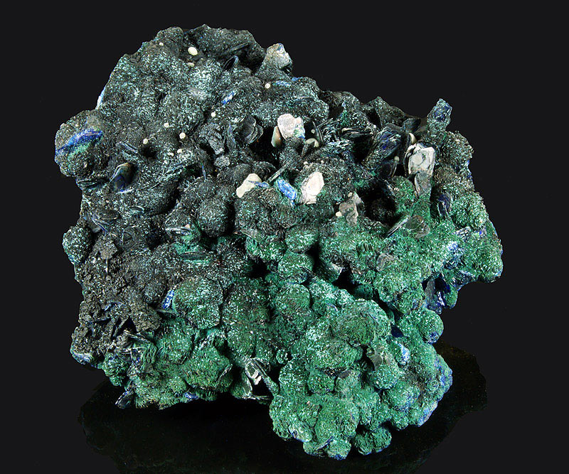 Very interesting combo offering most unusal flattened azurite crystals up to 13 mm covering/repkcing perphaps baryte crsytals? with globular malachite.