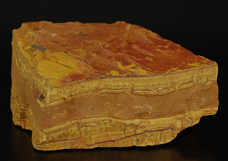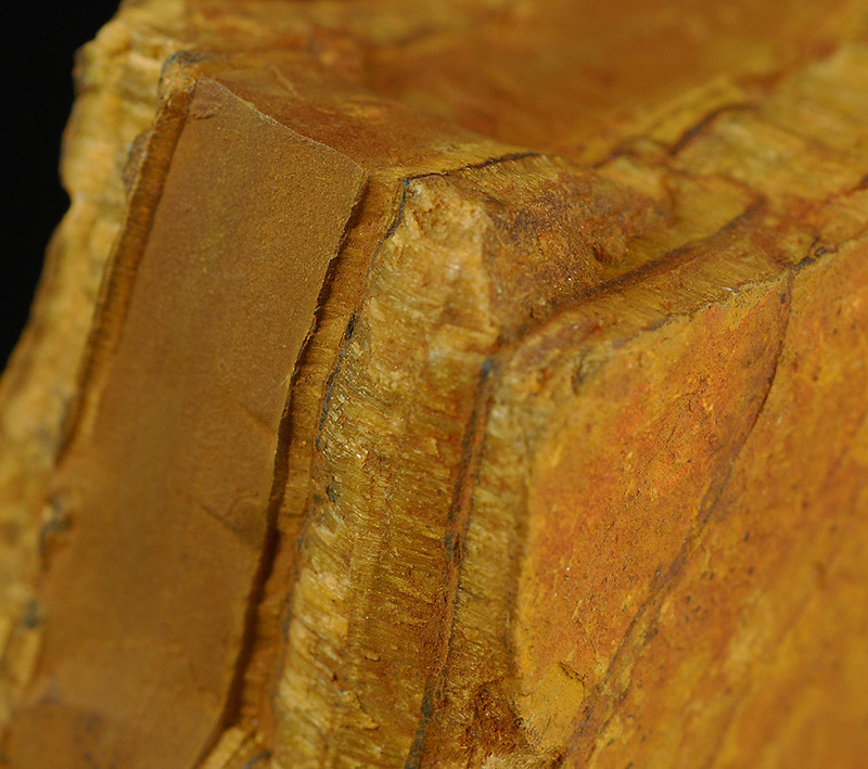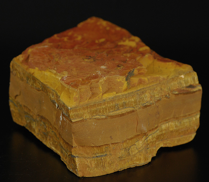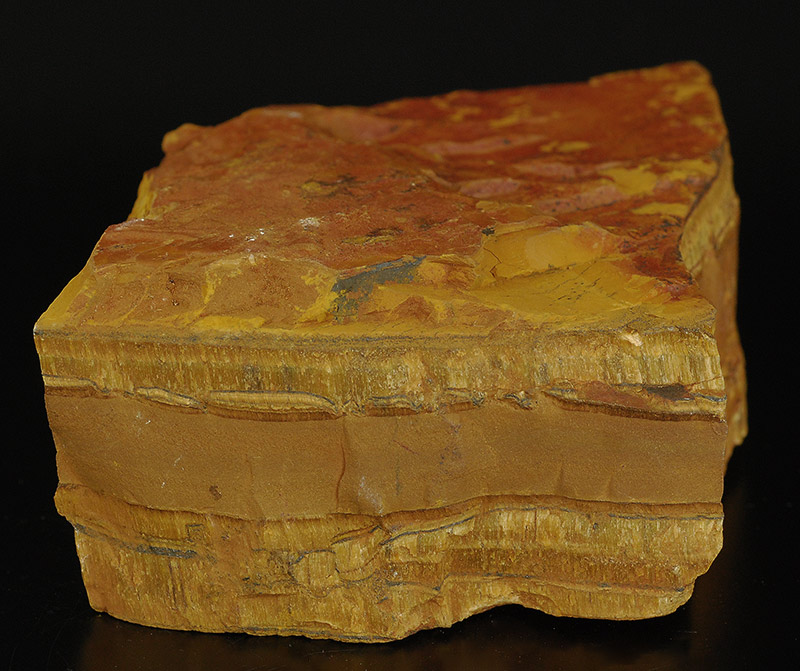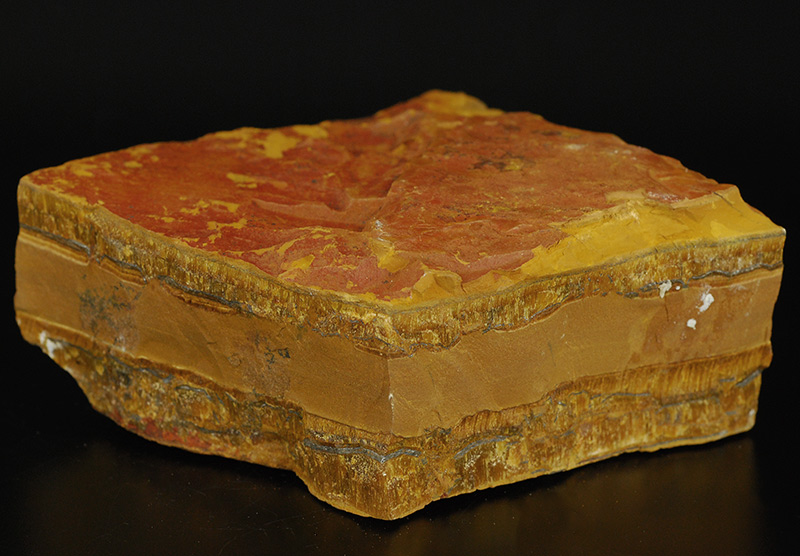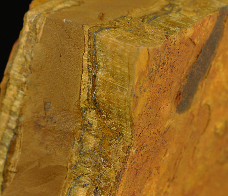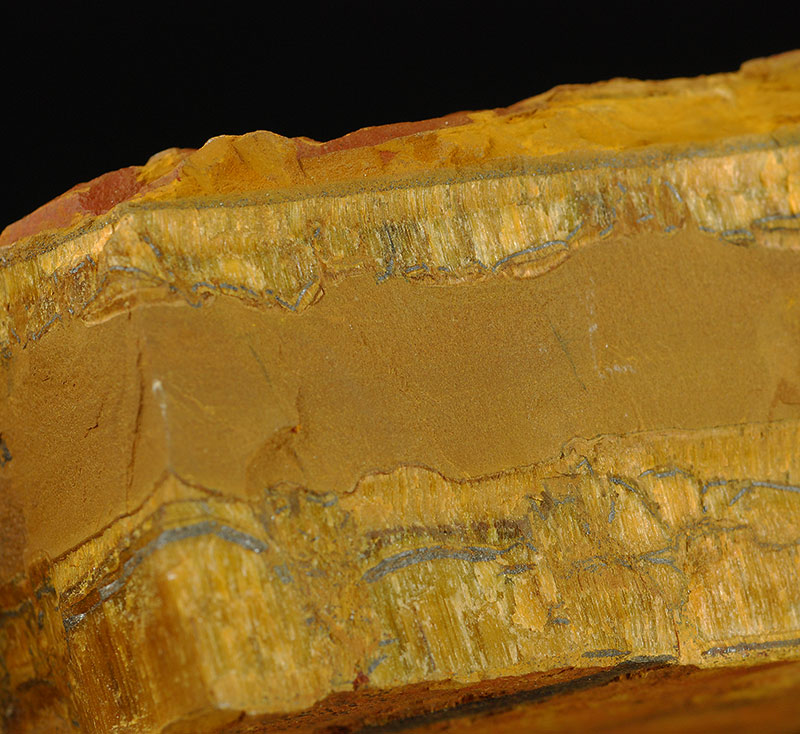 "Tiger eye" is a mixture of quartz and anphibole and is chatoyant because of parallel intergrowth of quartz crystals and altered amphibole fibres that mostly turned into limonite. In this specimen is visible in two veins between the riolitic matrix.