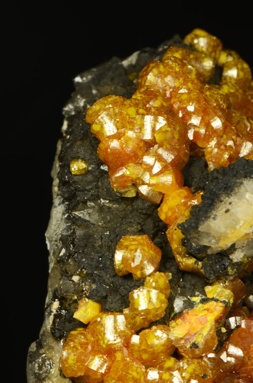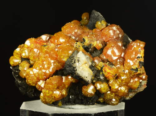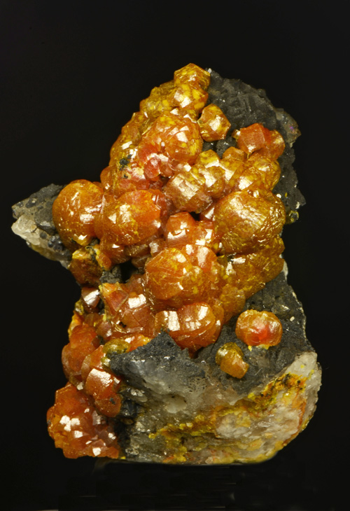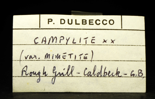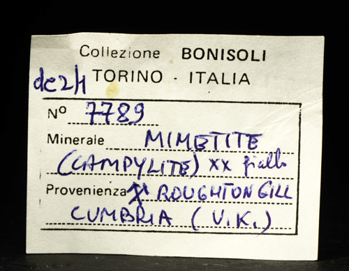 Cluster featuring several orange barrel shaped crystals of campylite, variety of mimetite, spread over matrix from the classic british locality in the Caldbeck Fells district. Former collection Bonisoli and P. Dulbecco, with labels. Very choicy!