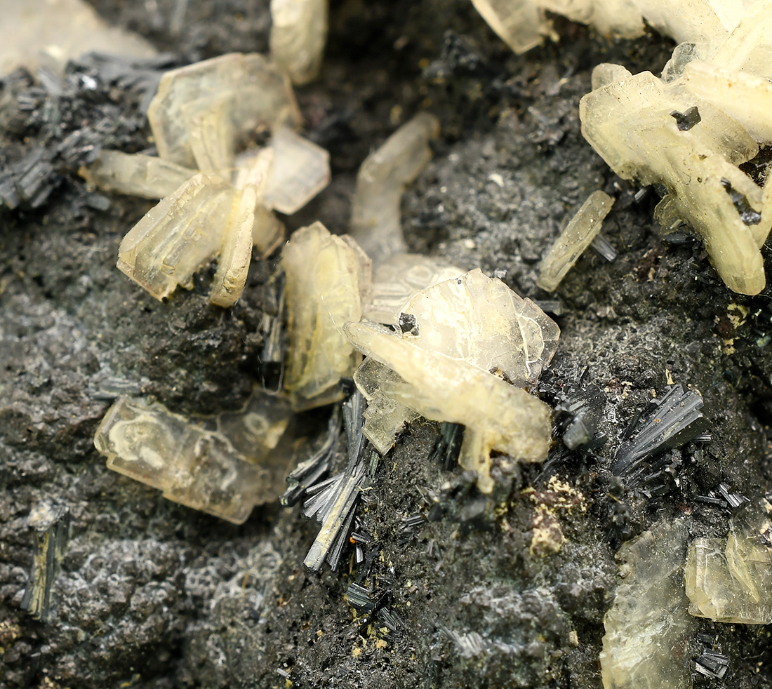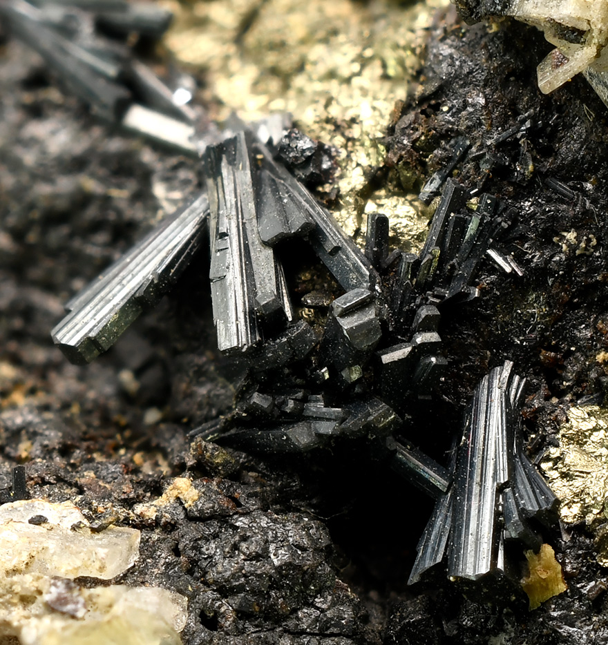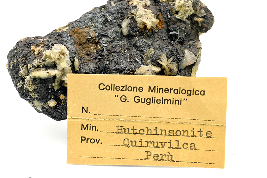 Very fresh bright metallic Hutchinsonite crystals up to 5 mm with Baryte xls in association from an old find in Quirivilca. Ex. coll. G. Guglielmini with original label.