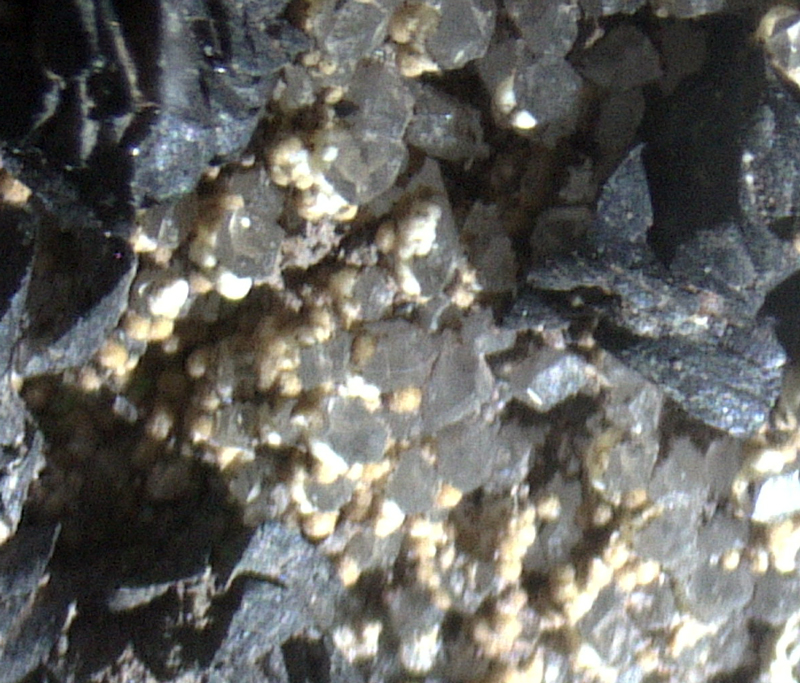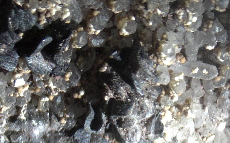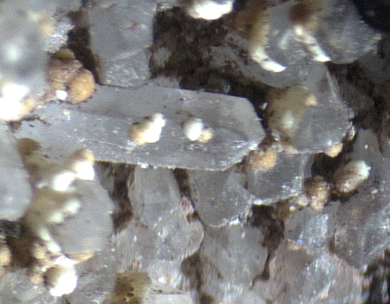 Nice white-yellow tiny montmorillonite xx with dark dolomite on matrix.